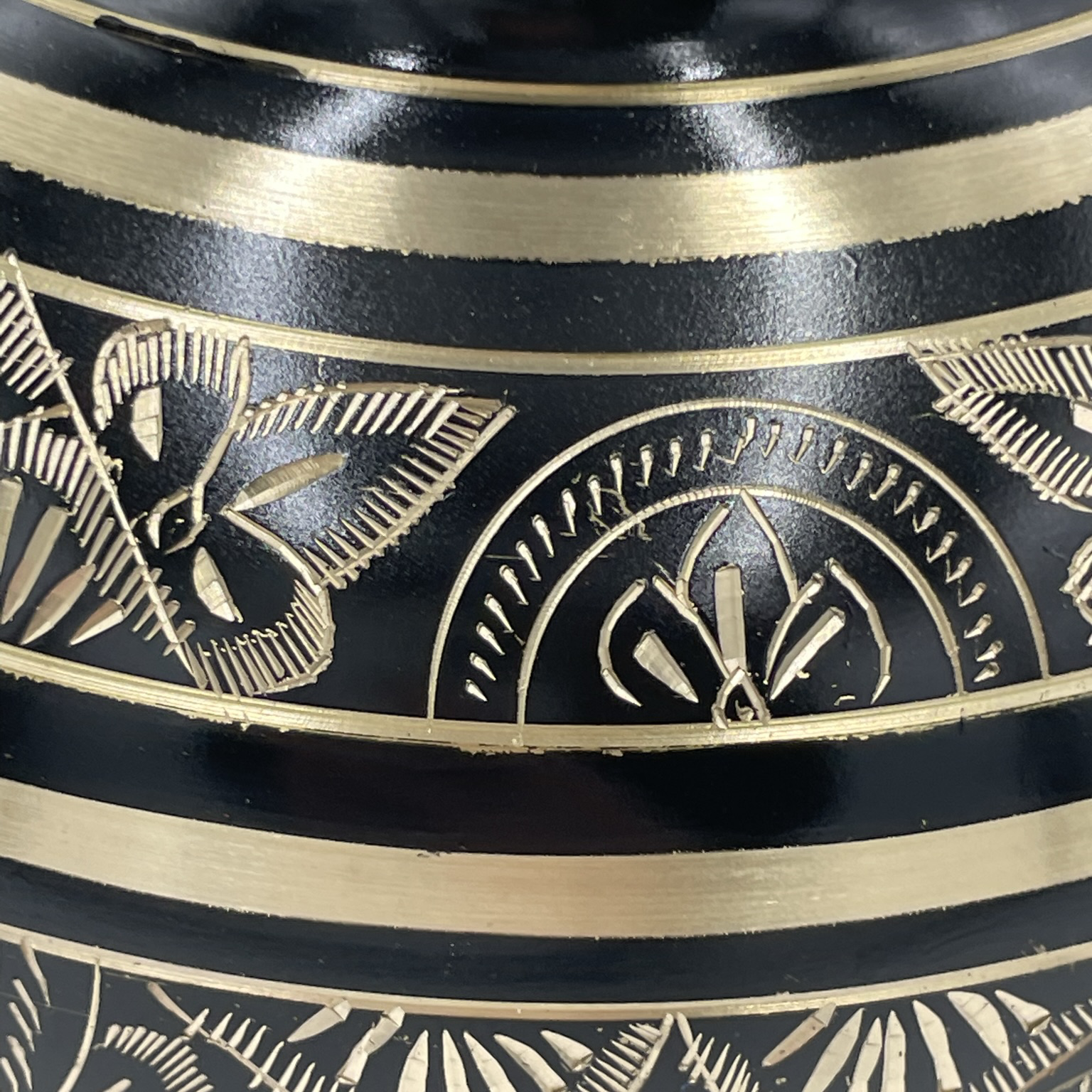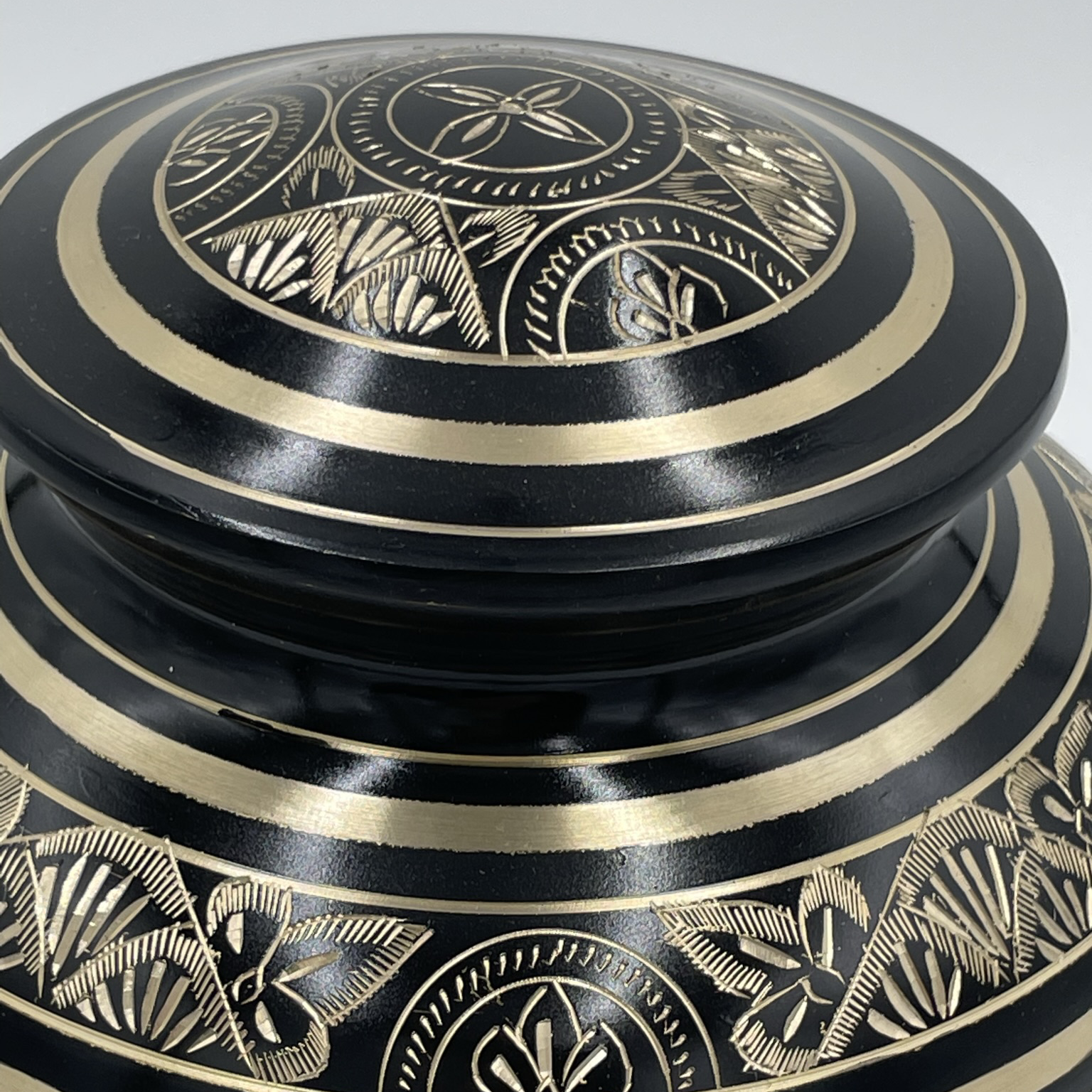 Handcrafted brass urn. Black with gold engraving. Screw top. 9.5" x 7". Standard Adult Size.