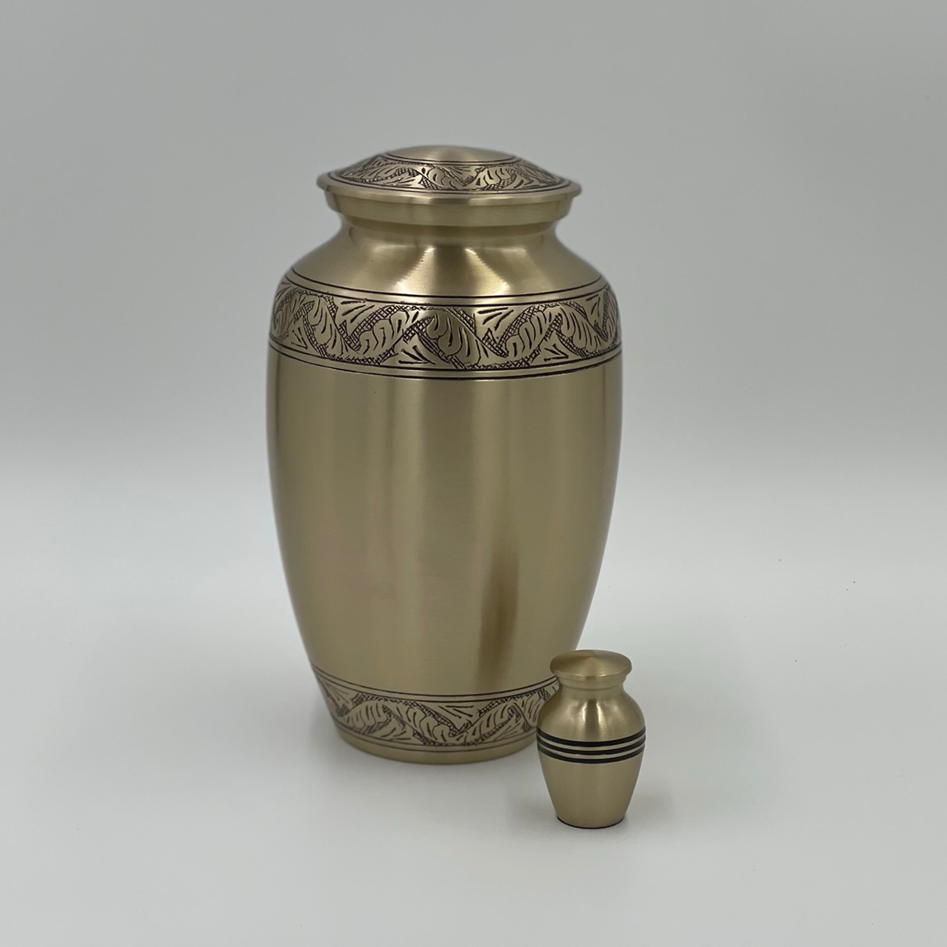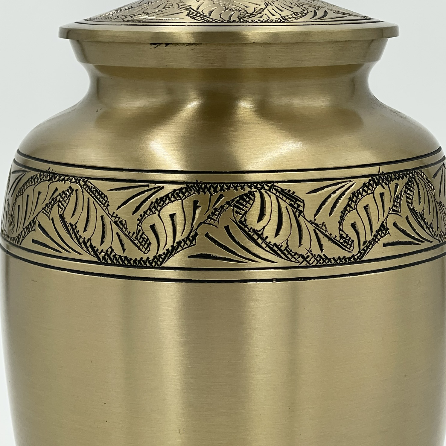 Handcrafted brass urn. Etched foliage banners. Highly durable and tarnish-resistant. Screw top. 10.5" x 6.5". Standard Adult Size.