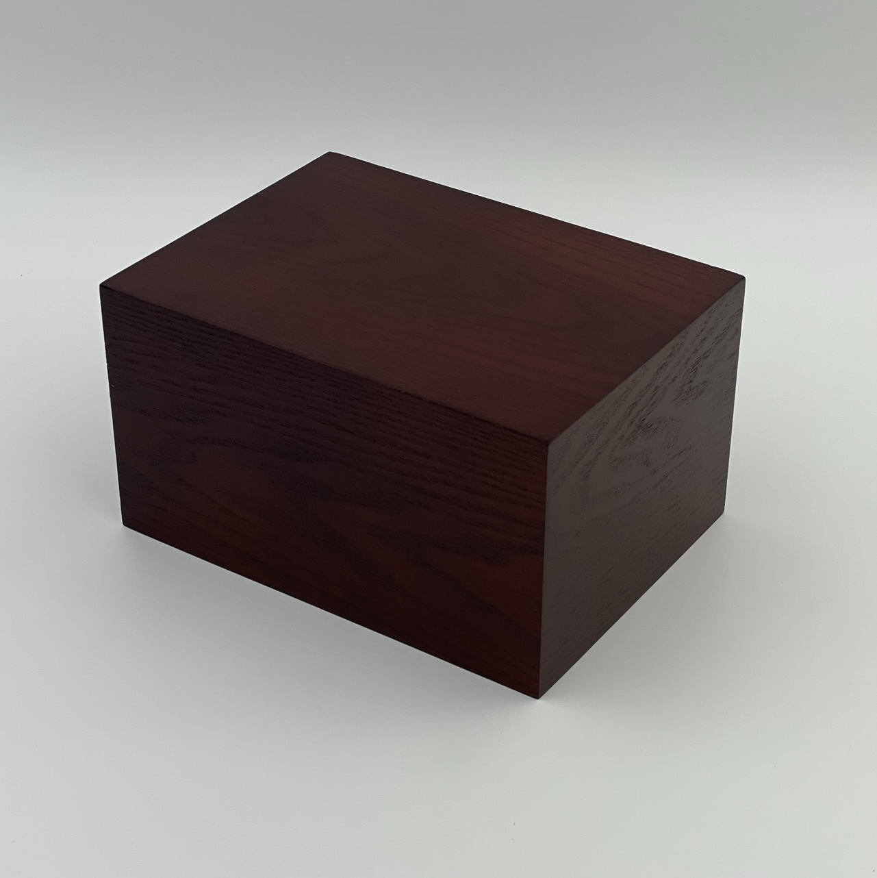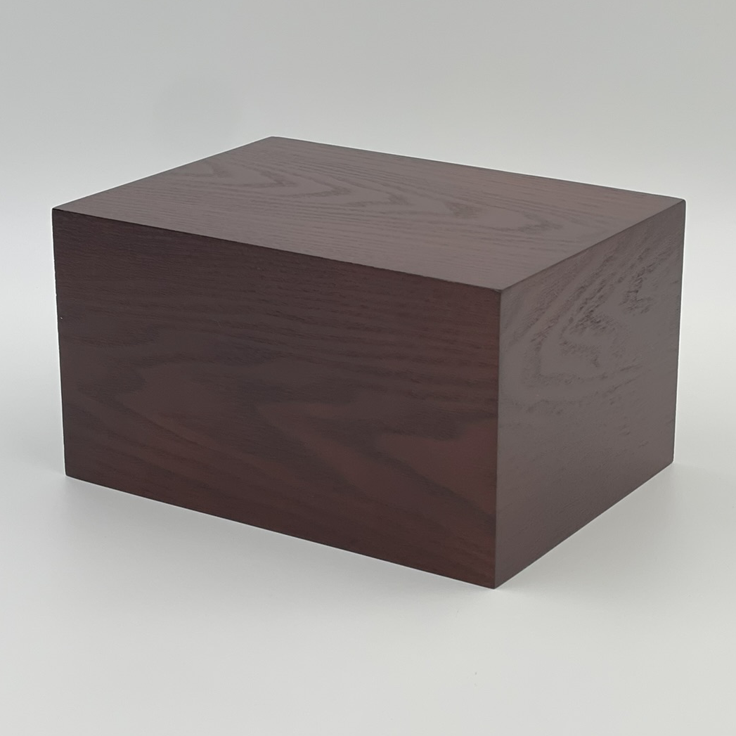 Engineered wood with wooden finish. Holds 200 cubic inches. Standard adult size urn. Closure on bottom with screws. 2.45 lbs. 9" x 5" x 6.75".